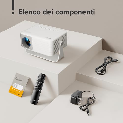La prima cosa che colpisce dell'AKIYO O1 sono le sue dimensioni incredibilmente ridotte. Con i suoi 13,6 x 11 x 5,8 cm e un peso di circa 420 grammi, è davvero uno dei proiettori più piccoli e leggeri sul mercato. Il design è minimalista e moderno, con una scocca in plastica bianca e grigia che risulta piacevole al tatto e resistente alle impronte digitali. Questa sua caratteristica lo rende un compagno di viaggio ideale, facile da infilare in uno zaino senza appesantire il carico. Nella confezione, oltre al proiettore, troviamo un pratico mini treppiede, un telecomando (batterie non incluse), un cavo HDMI e l'alimentatore. Un kit di base che permette di essere operativi in pochi minuti.