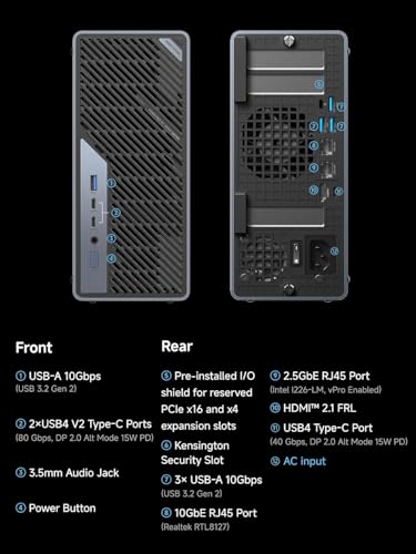 La connettività di rete è un altro fiore all'occhiello: l'MS-01 è un vero mostro in questo campo. Troviamo non solo il Wi-Fi 6E e due porte Ethernet da 2.5Gbps, ma anche due porte SFP+ da 10Gbps, una caratteristica rarissima in questa fascia di mercato e fondamentale per chi lavora con grandi file su reti locali ad alta velocità o necessita di un potente server domestico. Completano la dotazione due porte USB4 (compatibili Thunderbolt) che offrono velocità fino a 40 Gbps e la possibilità di collegare eGPU esterne per un ulteriore boost grafico.