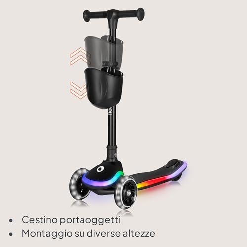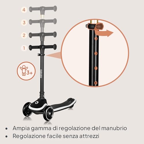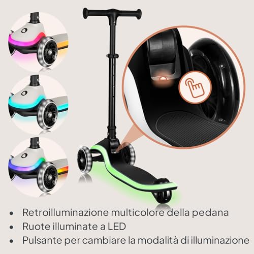 Una delle caratteristiche più amate dai bambini è senza dubbio l'illuminazione a LED. Il LIONELO MEY non delude le aspettative: sia le ruote che la pedana sono dotate di luci LED che si attivano con il movimento. Questo non solo rende il monopattino esteticamente molto accattivante, soprattutto durante le passeggiate serali, ma aumenta anche la visibilità del bambino, contribuendo a un ulteriore livello di sicurezza. L'effetto luminoso generato durante la corsa è davvero sorprendente e trasforma ogni uscita in un'avventura piena di colori.