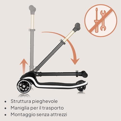 Il monopattino LIONELO MEY si presenta con un design moderno e colorato, disponibile in diverse varianti cromatiche come beige, rosa e nero, per accontentare i gusti di ogni bambino. La prima cosa che salta all'occhio è la sua struttura a tre ruote, due anteriori più grandi e una posteriore, pensata per offrire la massima stabilità ai piccoli piloti, specialmente a quelli alle prime armi. Questa configurazione, infatti, aiuta a sviluppare l'equilibrio e la coordinazione in totale sicurezza. La struttura è realizzata con materiali che appaiono robusti al tatto, pur mantenendo una notevole leggerezza (il peso si attesta intorno ai 2,8-3 kg), un fattore importante sia per il bambino, che può maneggiarlo senza fatica, sia per il genitore che deve trasportarlo.