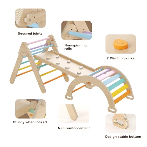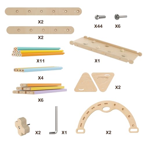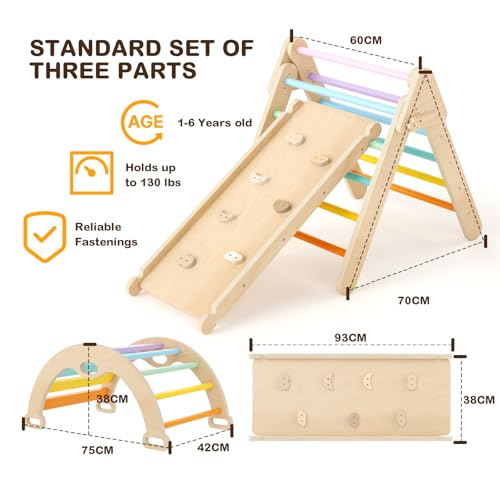 Il set è composto da tre elementi principali: un triangolo da arrampicata (noto anche come triangolo di Pikler), un arco da arrampicata e una rampa double-face, che da un lato è uno scivolo liscio e dall'altro una parete per arrampicarsi. La bellezza di questo prodotto sta nella sua incredibile versatilità: combinando i pezzi, si possono creare almeno 7 configurazioni diverse, stimolando continuamente la creatività dei piccoli esploratori.