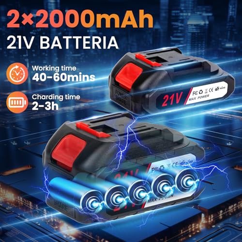 Un punto di forza dichiarato è la dotazione di due batterie al litio da 2000mAh (per un totale di 4000mAh). Questo è un vantaggio non da poco, perché consente di lavorare in continuità: mentre una batteria è in uso, l'altra può essere in carica. L'autonomia dichiarata per singola batteria si attesta tra i 50 e gli 80 minuti, un tempo sufficiente per la maggior parte dei lavoretti domestici. Le batterie sono inoltre dotate di protezione da sovraccarico e surriscaldamento, un dettaglio importante per la sicurezza e la longevità.