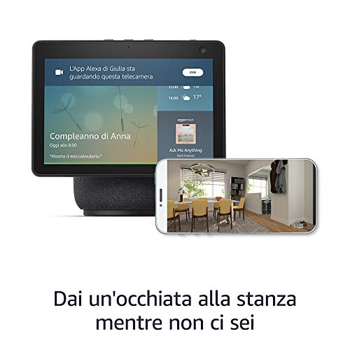 Una funzione particolarmente interessante è la possibilità di utilizzare l'Echo Show 10 come telecamera di sicurezza. Tramite l'app Alexa, è possibile accedere da remoto alla videocamera del dispositivo e ruotare la visuale per controllare l'intera stanza, una funzione molto utile quando si è fuori casa.