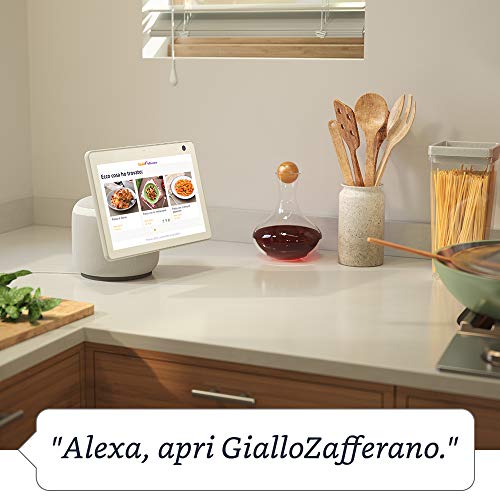 Nell'uso di tutti i giorni, avere uno schermo che si gira verso di te è davvero comodo. Immagina di essere in cucina con le mani impegnate: puoi chiedere ad Alexa di mostrarti il prossimo passaggio di una ricetta e lo schermo si orienterà perfettamente verso di te, ovunque tu sia. Lo stesso vale per le videochiamate con amici e parenti: la telecamera da 13 MP, dotata di inquadratura automatica, non solo ti segue, ma effettua anche degli zoom per mantenerti sempre al centro della scena, come se avessi un regista personale.