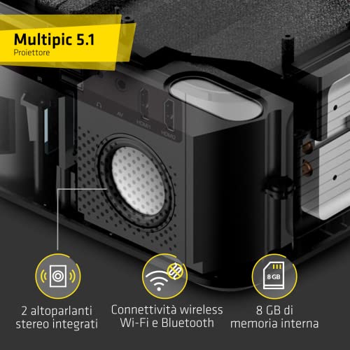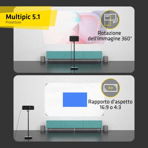 A livello di design, il Multipic 5.1 è compatto e relativamente leggero, il che lo rende facile da spostare da una stanza all'altra o persino da portare a casa di amici per una serata film. La sua versatilità è uno dei suoi cavalli di battaglia, essendo adatto non solo all'home cinema ma anche a presentazioni di lavoro o alla visione di eventi sportivi in compagnia.