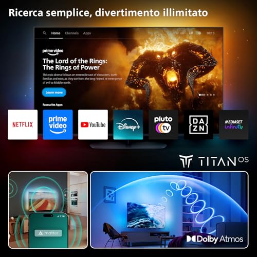 Una delle novità più significative di questa serie è l'adozione del nuovo sistema operativo Titan OS. Questa piattaforma smart si propone come un'alternativa veloce e facile da usare, progettata per portare rapidamente l'utente ai contenuti che ama. L'interfaccia è pulita e intuitiva, e le principali app di streaming come Netflix, Prime Video, Disney+ e YouTube sono ovviamente presenti e facilmente accessibili.