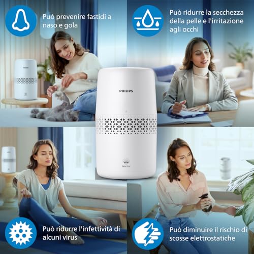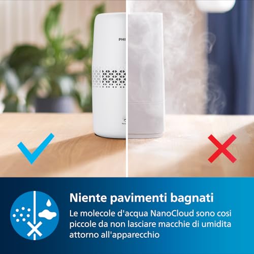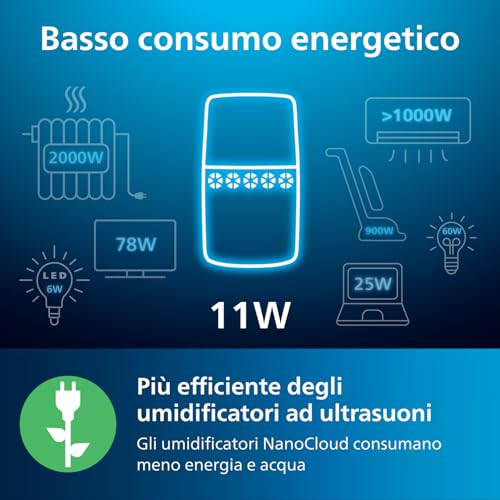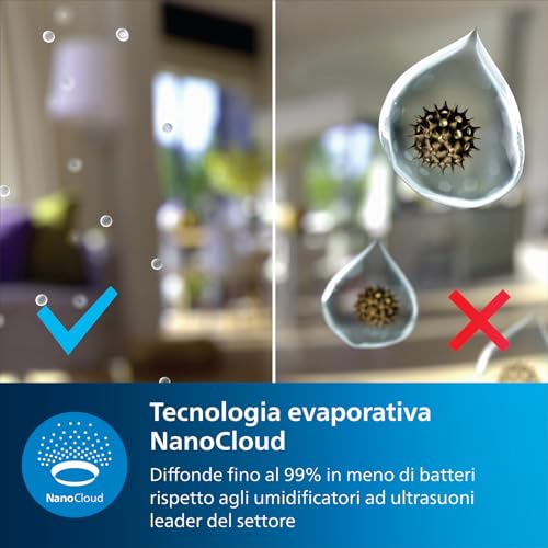 Il vero cuore di questo umidificatore è la sua tecnologia di nebulizzazione. Philips la chiama SkyHigh Mist, e non è solo un nome accattivante. A differenza di molti umidificatori a ultrasuoni che tendono a bagnare le superfici circostanti, questo modello emette una nebulizzazione finissima che si innalza verticalmente per oltre 80 cm. Questo assicura una distribuzione dell'umidità molto più ampia e uniforme nella stanza, evitando la fastidiosa formazione di condensa o goccioline d'acqua sui mobili.