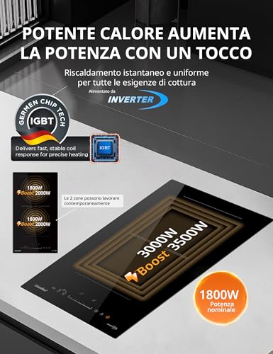 La vera star è la funzione Boost, presente su tutte le zone di cottura. Attivandola, il piano eroga la massima potenza per un breve periodo, ideale per portare a ebollizione l'acqua per la pasta in un lampo o per scottare rapidamente una bistecca. Durante i nostri test, questa funzione si è rivelata estremamente efficace, riducendo notevolmente i tempi di attesa. La potenza complessiva varia a seconda del modello: si va dai 3500W per le versioni a due zone fino ai 7200-7400W per quelle a quattro zone, valori che garantiscono performance eccellenti.
