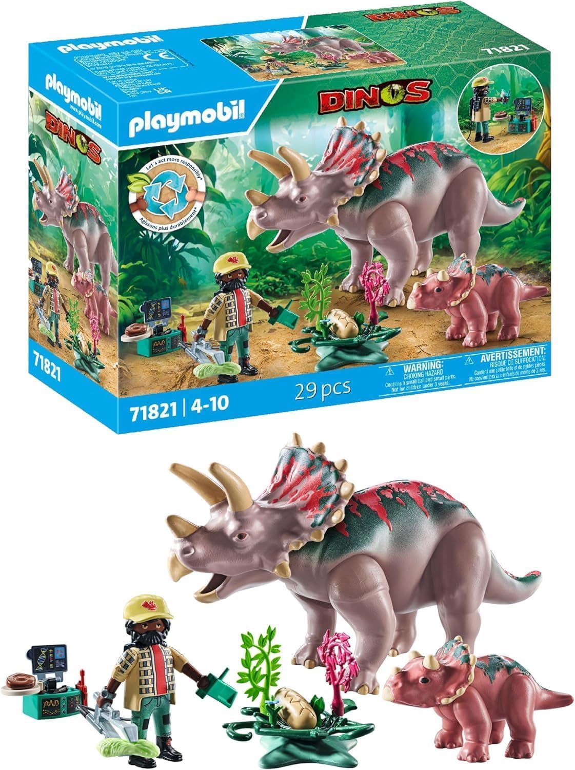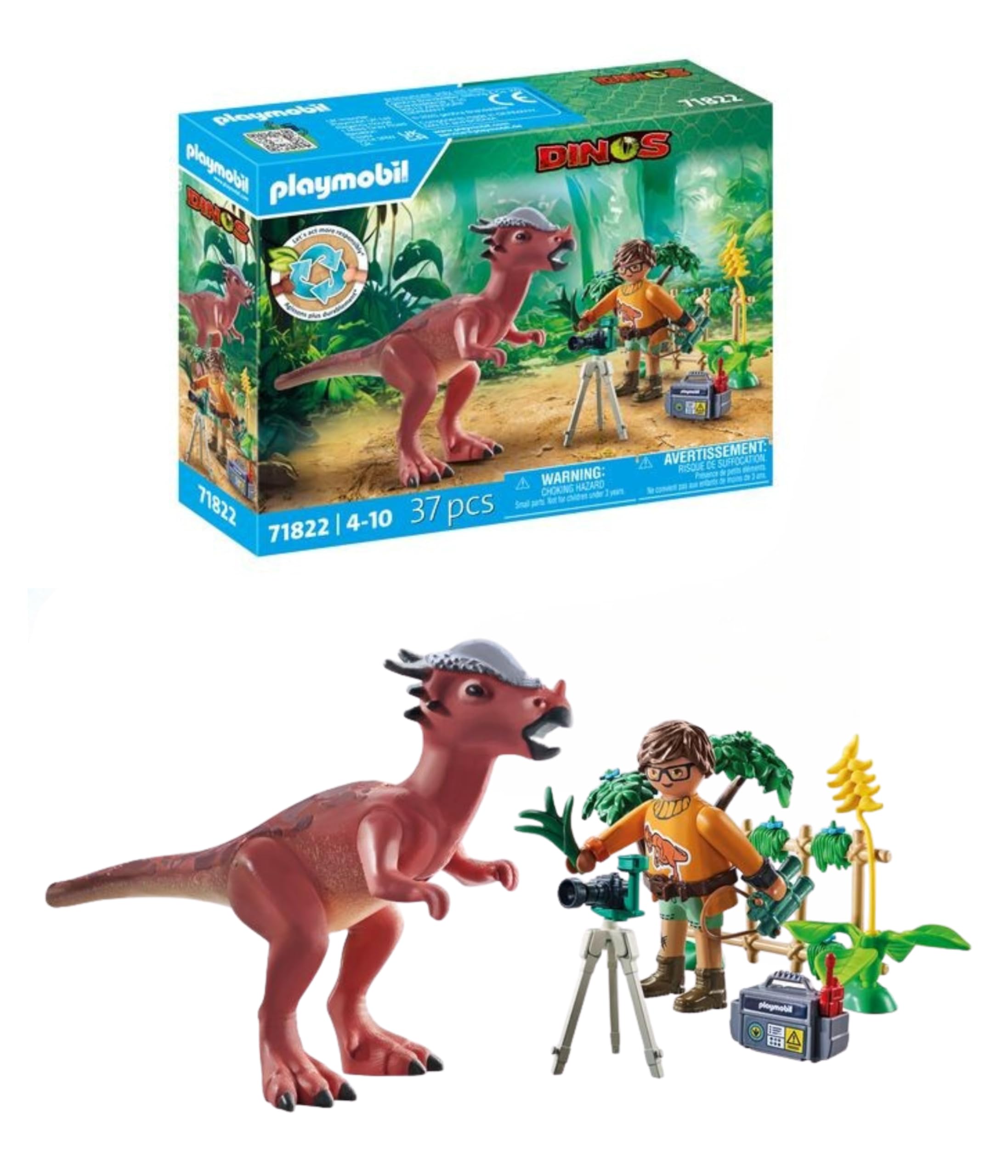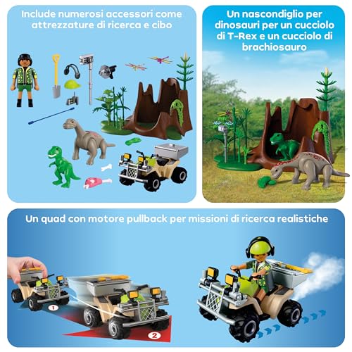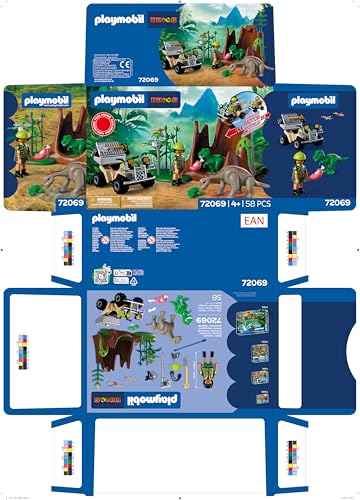 Oltre ai dinosauri, il set include due personaggi PLAYMOBIL, due ricercatori pronti all'azione, e una serie di animali più piccoli come un serpente e una libellula, che arricchiscono l'ambientazione della giungla. Il cuore del set è il campo base, una piccola postazione di ricerca dotata di tutto il necessario: un tavolo, un microscopio per analizzare le uova di dinosauro, un computer portatile, una macchina fotografica e walkie-talkie per le comunicazioni. Non manca un nido con tre uova di dinosauro, elemento centrale di molte possibili trame narrative.