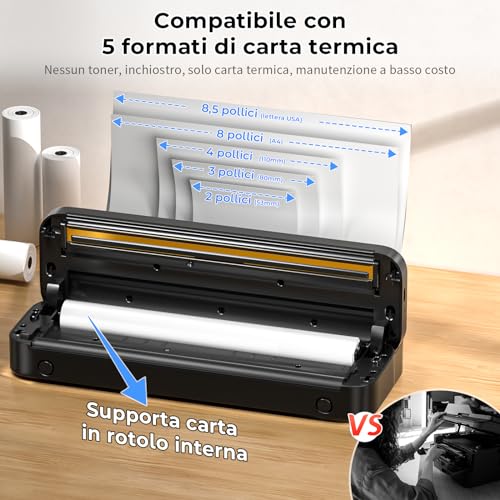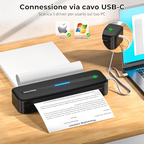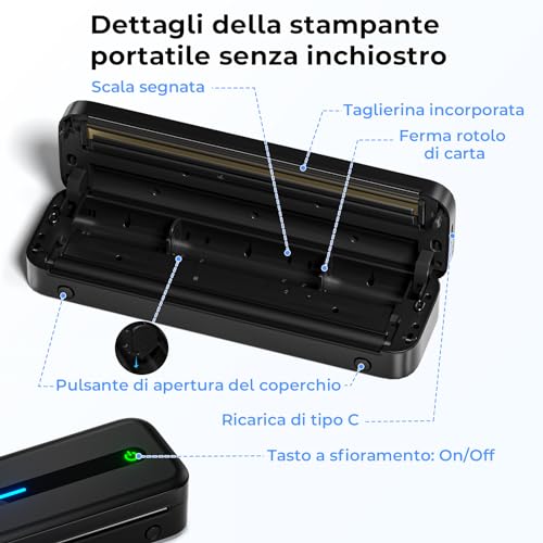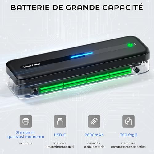 Uno dei punti di forza di questa stampante è l'assenza di costi ricorrenti per inchiostro o toner. L'unico consumabile è la carta termica, che ha un costo generalmente contenuto. La batteria integrata da 2600mAh offre un'ottima autonomia, permettendo di stampare un numero considerevole di pagine con una singola carica. La ricarica avviene tramite un comodo cavo USB-C, quindi è possibile ricaricarla facilmente con un power bank o il caricatore dello smartphone. Questo la rende una compagna di viaggio davvero affidabile.