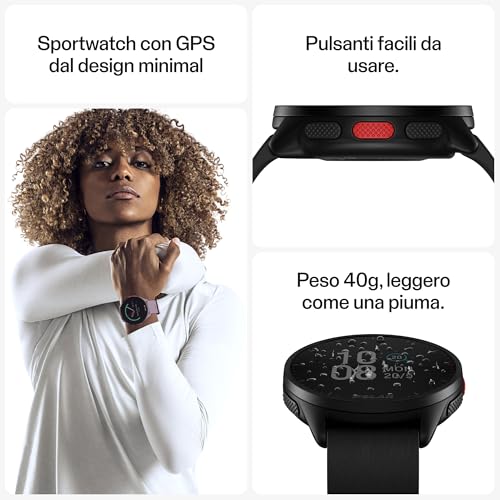 La prima cosa che si nota indossando il Polar Pacer è la sua incredibile leggerezza. Con un peso di soli 40 grammi, ti dimenticherai quasi di averlo al polso, sia durante la corsa che nella vita di tutti i giorni. La cassa in plastica è robusta e progettata per resistere agli urti, mentre i cinque pulsanti fisici, zigrinati e facili da premere, sono una scelta vincente: garantiscono un controllo perfetto anche con le mani sudate o con i guanti, situazioni in cui un touchscreen sarebbe solo d'intralcio.