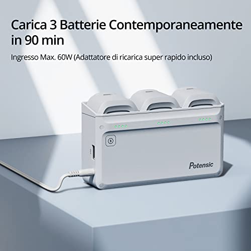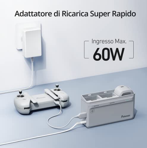 L'hub supporta anche la sostituzione "a caldo" delle batterie, il che significa che puoi rimuovere una batteria completamente carica e inserirne un'altra da caricare senza dover spegnere l'alimentazione. È importante notare che, per ottenere le massime prestazioni e una ricarica veloce, è fondamentale utilizzare l'adattatore originale Potensic da 60W, spesso incluso nei kit "Fly More Combo" o venduto insieme all'hub.