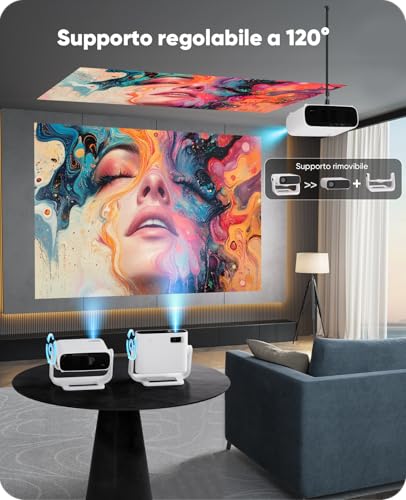 Appena tolto dalla scatola, il Proiettore intelligente Wielio Android 11 colpisce per il suo design compatto e moderno. Con le sue linee pulite e le dimensioni contenute, si adatta facilmente a qualsiasi ambiente, dal salotto alla camera da letto. La vera chicca, però, è il supporto integrato regolabile fino a 120-180 gradi, a seconda del modello specifico. Questa caratteristica si è rivelata incredibilmente comoda durante i nostri test: permette di proiettare l'immagine ovunque, persino sul soffitto, senza bisogno di pile di libri o supporti improvvisati.
