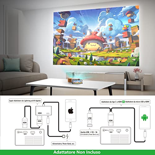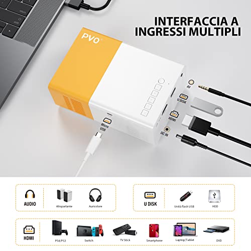 Uno degli aspetti più interessanti di questo mini proiettore è la sua versatilità. È dotato di una buona varietà di porte, tra cui HDMI, USB, slot per MicroSD e un'uscita audio da 3.5mm. Questo permette di collegarlo a una vasta gamma di dispositivi: laptop, console per videogiochi (come la Nintendo Switch), lettori multimediali come la Fire TV Stick di Amazon, e persino fotocamere digitali.