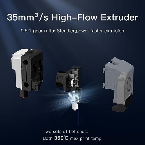 - Estrusore Direct Drive Leggero: L'estrusore a trasmissione diretta è stato riprogettato per essere più leggero (circa 600g), ha un rapporto di trasmissione di 9.5:1 e garantisce un flusso massimo di 35mm³/s, assicurando un'estrusione potente e costante.