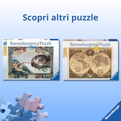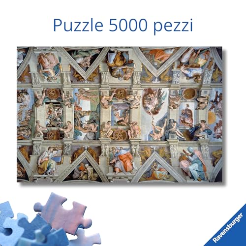 Aprire la scatola del Ravensburger Puzzle Cappella Sistina da 5000 pezzi (codice 17429) è un'emozione che ogni appassionato di puzzle dovrebbe provare. Ci si trova di fronte non a un semplice gioco, ma a una vera e propria impresa: ricomporre uno dei più grandi capolavori dell'arte rinascimentale. Le dimensioni finali, ben 153 x 101 cm, fanno subito intuire l'imponenza del lavoro che ci attende, un'opera che, una volta completata, può trasformarsi in un magnifico elemento d'arredo.