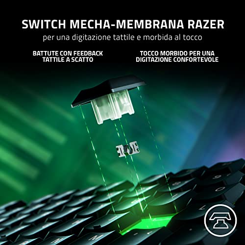 - Razer Ornata V3: È il modello principale, oggetto di questa recensione, con switch Mecha-membrana, poggia polsi magnetico soft-touch e tasti multimediali dedicati.