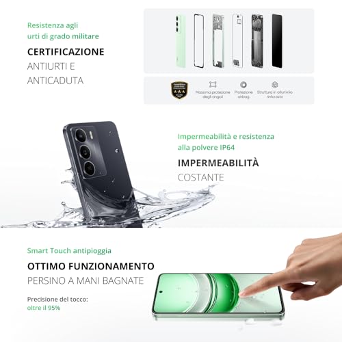 La prima cosa che si nota prendendo in mano il realme 14X 5G è la sua solidità. Nonostante un peso di circa 197 grammi e uno spessore di 7.94 mm, risulta ben bilanciato e maneggevole. La scocca è in plastica, ma la finitura opaca e il design con bordi piatti gli conferiscono un aspetto moderno e piacevole. Ma il vero punto di forza è la sua corazza: questo smartphone non teme le sfide della vita quotidiana. Vanta infatti la certificazione MIL-STD-810H di grado militare, che lo protegge da cadute e urti, e una notevole resistenza a polvere e acqua con certificazioni che arrivano fino a IP69. Questo significa che può resistere a getti d'acqua ad alta pressione e persino a brevi immersioni, una caratteristica quasi unica in questa fascia di mercato. Realme ha persino incluso tecnologie come la SonicWave Water Ejection, che usa le vibrazioni dell'altoparlante per espellere l'acqua in eccesso.