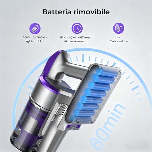 Un grande vantaggio è la batteria rimovibile. Questo significa che è possibile acquistare una seconda batteria per raddoppiare di fatto l'autonomia, una caratteristica molto comoda per chi ha case di grandi dimensioni. La ricarica completa richiede circa 4 ore.