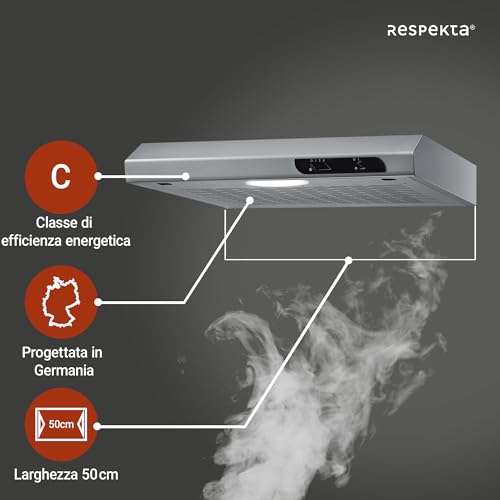 La cappa aspirante da incasso Respekta DH540IXL si presenta con un design semplice e funzionale, pensato per integrarsi con discrezione nella maggior parte delle cucine, specialmente quelle di dimensioni contenute. La sua struttura da 50 cm di larghezza la rende ideale per essere installata sotto un pensile, sopra piani cottura di dimensioni standard. La finitura effetto acciaio inox le conferisce un aspetto moderno e pulito, anche se il materiale principale è lamiera d'acciaio verniciata. Al tatto, la sensazione è quella di un prodotto solido ma senza particolari pretese di lusso, in linea con la sua fascia di mercato.