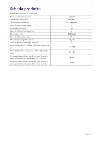 Dal punto di vista dei consumi, la Respekta DH540IXL si colloca in classe di efficienza energetica C, con un consumo annuo stimato di 35 kWh. Non è un campione di risparmio energetico, ma il dato è accettabile per un elettrodomestico di questa fascia. Meno lusinghieri sono i dati relativi all'efficienza fluidodinamica e alla capacità di filtraggio dei grassi, entrambe classificate in classe E. Questo significa che le prestazioni in termini di movimento dell'aria e di cattura delle particelle di grasso sono piuttosto basilari.