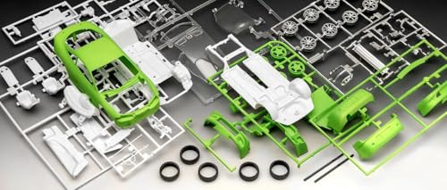 Appena aperta la confezione, la prima cosa che salta all'occhio è il colore della plastica: un verde brillante che richiama immediatamente la livrea dell'auto del film. Tuttavia, come fanno notare molti modellisti esperti, per ottenere un risultato davvero fedele e vibrante, è consigliabile verniciare la carrozzeria. Il kit è un "rebox" di uno stampo più datato, ma ancora di buona qualità, con dettagli ben definiti. La confezione include diversi sprue (le griglie a cui sono attaccati i pezzi) in plastica verde, bianca, due sprue cromati e due per le parti trasparenti come vetri e fari. Completano la dotazione quattro pneumatici in gomma morbida, due assi in metallo e una vite per l'assemblaggio del telaio.