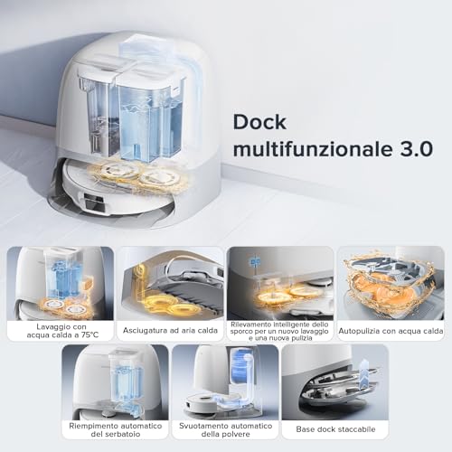 - Rilevamento intelligente dello sporco: La base è in grado di analizzare il livello di sporco dei moci e, se necessario, avviare un secondo ciclo di lavaggio per garantire una pulizia impeccabile.