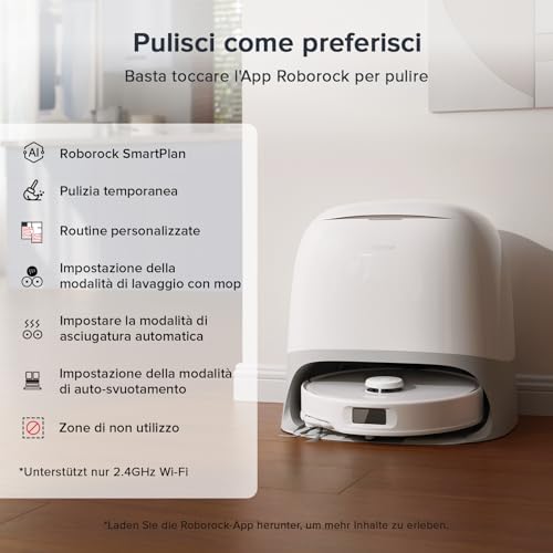 L'applicazione Roborock è completa e intuitiva, offrendo un'ampia gamma di personalizzazioni. È possibile impostare routine di pulizia specifiche per ogni stanza, regolare la potenza di aspirazione e il flusso d'acqua, creare zone vietate e molto altro. Inoltre, l'assistente vocale integrato "Hello Rocky" permette di controllare il robot con semplici comandi vocali.