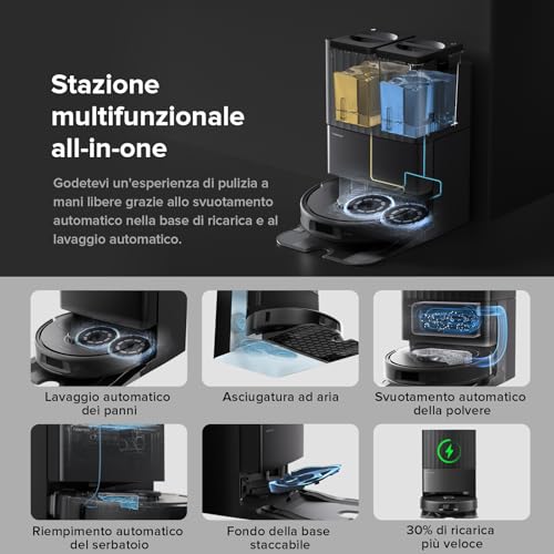 Il pezzo forte del sistema è senza dubbio la stazione multifunzione. Questo non è un semplice dock di ricarica, ma un centro di comando che rende il robot quasi completamente autonomo. Ecco cosa fa: