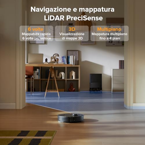 Il Roborock QV 35A si muove per la casa con grande sicurezza grazie al sistema di navigazione LiDAR PreciSense, che mappa l'ambiente con estrema precisione. Questo gli permette di creare percorsi di pulizia ottimizzati e di non tralasciare nessuna zona. L'app Roborock, semplice e intuitiva, permette di visualizzare le mappe (anche su più piani), definire stanze, creare zone vietate e programmare pulizie personalizzate.