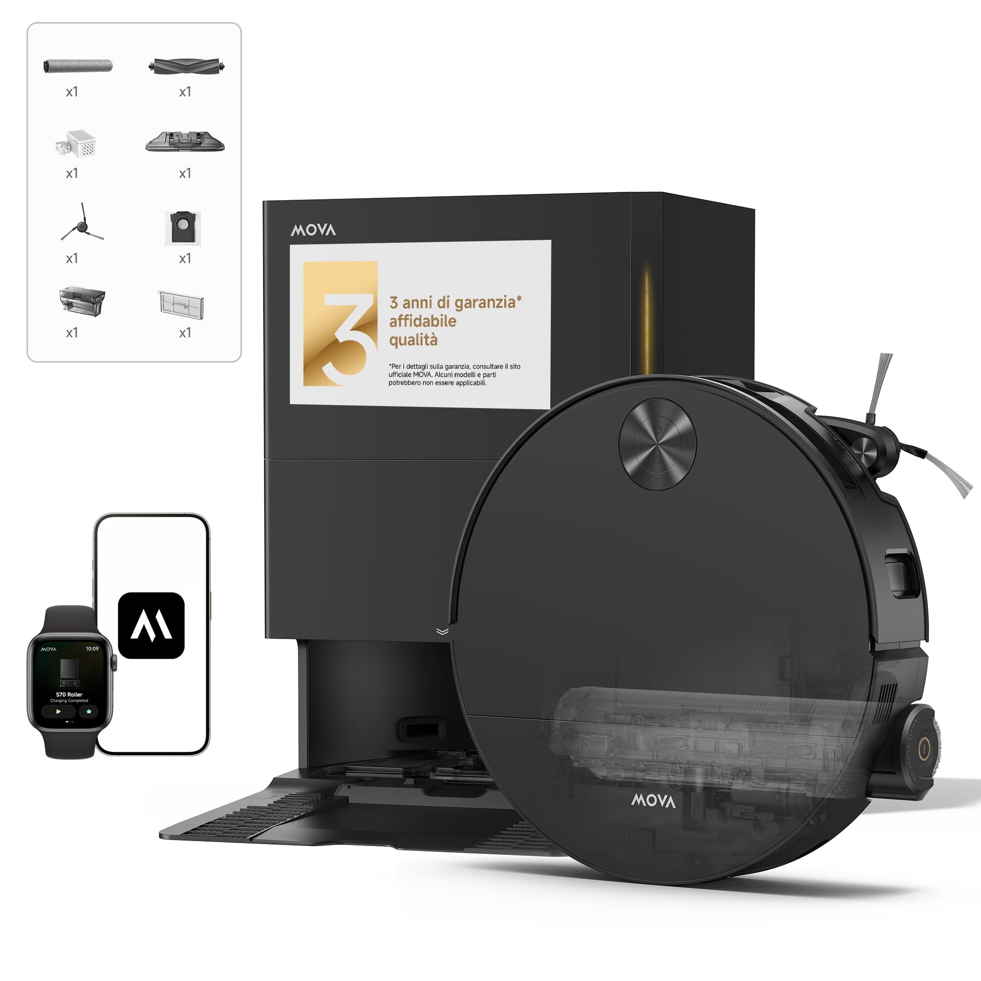- Mova S70 e Z60 con tecnologia Roller: Questi modelli abbandonano i classici panni rotanti (mop) in favore di un rullo lavapavimenti. Il rullo, simile a quello delle lavasciuga professionali, viene costantemente bagnato con acqua pulita (il modello S70 usa 12 ugelli dedicati) ed esercita una pressione costante sul pavimento (fino a 17N per l'S70), garantendo una pulizia più energica e omogenea. La base di ricarica si occupa poi di lavare il rullo con acqua calda fino a 80°C e di asciugarlo con aria calda, prevenendo la formazione di batteri e cattivi odori.