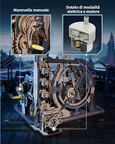Il kit offre una doppia modalità di funzionamento: manuale, tramite una manovella, e automatica, grazie al motorino elettrico incluso. Questa versatilità aggiunge un ulteriore livello di interesse al modello, permettendo di apprezzare la meccanica degli ingranaggi in azione sia in modo interattivo che come spettacolo continuo.