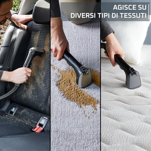 Il segreto dell'efficacia del Rowenta Clean It sta nella sua tripla azione di pulizia: spruzzo, spazzolamento e aspirazione. In pratica, l'apparecchio prima spruzza una miscela di acqua e detergente direttamente sulla macchia, poi le setole della spazzola agiscono meccanicamente per smuovere lo sporco in profondità e infine la potente aspirazione rimuove l'acqua sporca e i residui, lasciando il tessuto quasi asciutto.