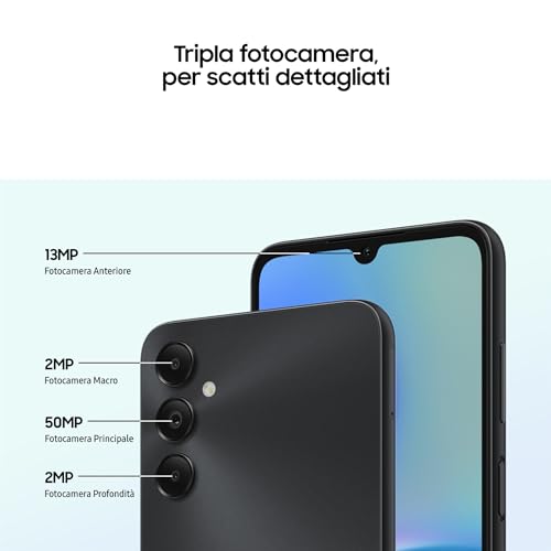 Il comparto fotografico del Samsung Galaxy A05s è composto da un sensore principale da 50 MP con autofocus, affiancato da due sensori da 2 MP per le macro e la profondità di campo. La fotocamera frontale per i selfie è da 13 MP.