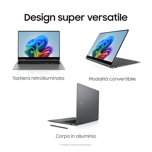 Il vero punto di forza, come suggerisce il nome, è la sua natura convertibile. La cerniera a 360 gradi permette di ruotare completamente lo schermo, trasformando il notebook in un tablet di grandi dimensioni in un istante. Questa flessibilità è perfetta per diverse modalità d'uso: dalla classica modalità laptop per la produttività, alla modalità tenda o stand per presentazioni e fruizione di contenuti multimediali, fino alla modalità tablet per disegnare, prendere appunti o navigare in modo più informale, grazie anche al supporto della S Pen inclusa.