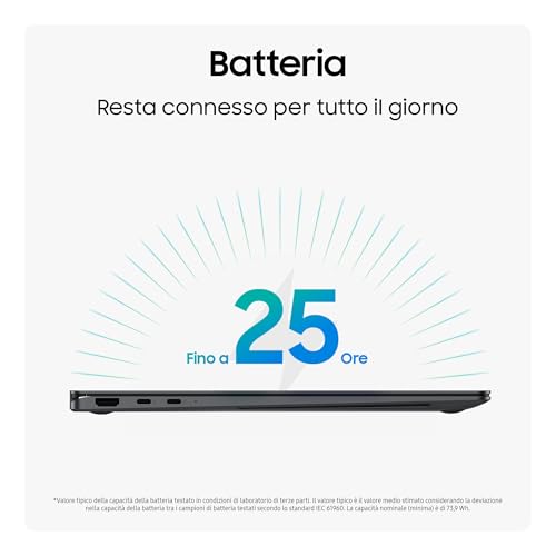 Uno degli aspetti più impressionanti del Galaxy Book5 Pro 360 è l'autonomia. Grazie all'efficienza dei nuovi processori Intel e a una capiente batteria da 76 Wh, Samsung dichiara fino a 25 ore di riproduzione video con una singola carica. Sebbene nell'uso reale e variegato questo valore possa diminuire, l'autonomia rimane eccellente e permette di coprire abbondantemente un'intera giornata lavorativa senza bisogno di cercare una presa di corrente. La ricarica rapida a 65W, inoltre, consente di ottenere ore di utilizzo con pochi minuti di carica.