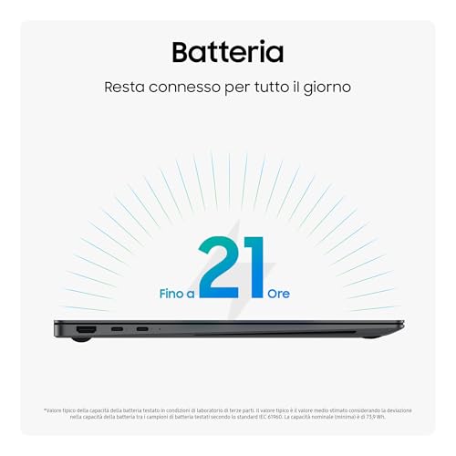Uno degli aspetti più impressionanti di questo notebook è senza dubbio la durata della batteria. Grazie all'efficienza del nuovo processore Intel Core Ultra Serie 2 e all'ottimizzazione software di Samsung, l'autonomia è a dir poco straordinaria. Samsung dichiara fino a 21 ore di riproduzione video per il modello da 14 pollici, e i test indipendenti confermano questi dati, con alcuni che si spingono oltre le 23 ore in condizioni specifiche. Nell'uso reale, fatto di navigazione, produttività da ufficio e streaming, si può tranquillamente coprire un'intera giornata lavorativa (e anche di più) lontano dalla presa di corrente. La ricarica rapida, inoltre, permette di ottenere circa il 41% di carica in soli 30 minuti, minimizzando i tempi di inattività.