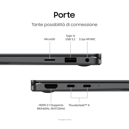 La vera sorpresa, però, è la dotazione di porte. A differenza di molti concorrenti che sacrificano la connettività in nome del design, Samsung ha equipaggiato il Book5 Pro con tutto il necessario: due porte Thunderbolt 4 (USB-C), una porta USB-A 3.2, un'uscita HDMI 2.1 a grandezza standard, un lettore di schede microSD e il jack audio da 3,5 mm. Questa completezza è un enorme punto a favore, eliminando la necessità di portarsi dietro scomodi adattatori.
