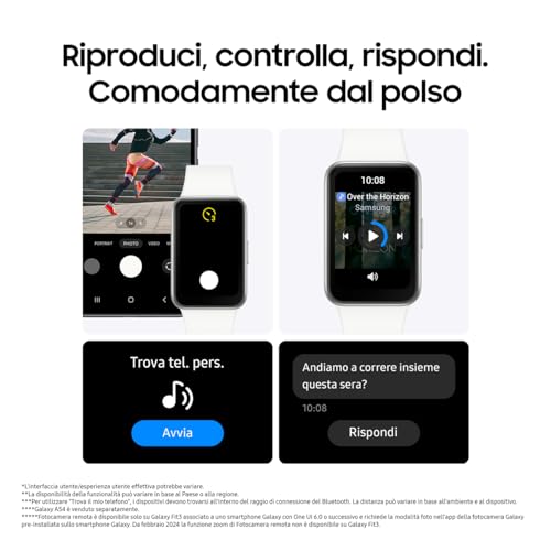 Il Galaxy Fit3 non è solo un fitness tracker, ma si comporta quasi come uno smartwatch. È possibile ricevere e leggere le notifiche di chiamate, SMS e app social, e persino inviare risposte rapide personalizzabili. Dal polso si può anche controllare la riproduzione musicale dello smartphone, usare il Fit3 come telecomando per scattare foto e far squillare il telefono se non lo si trova più.