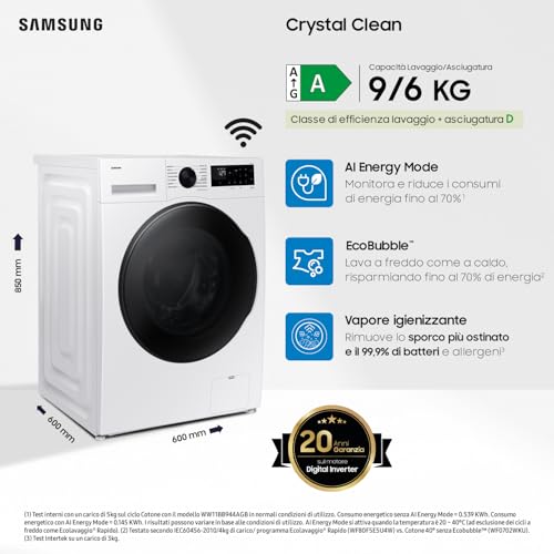 La Samsung Lavasciuga Crystal WiFi WD90DG5B15BEET è un elettrodomestico completo, intelligente e performante, che riesce a sfatare molti miti legati alle lavasciuga. È la scelta ideale per chi cerca la comodità di un apparecchio 2-in-1 senza voler rinunciare a risultati di lavaggio eccellenti, a un'igiene profonda e alle funzionalità smart che semplificano la vita quotidiana. La capacità generosa la rende perfetta per le famiglie, mentre le tecnologie innovative come AI Ecobubble e il Vapore Igienizzante offrono un reale valore aggiunto. Sebbene la classe energetica del ciclo combinato possa far storcere il naso, le funzioni di risparmio energetico aiutano a tenere sotto controllo i consumi. Un prodotto decisamente consigliato per chi vuole un bucato impeccabile con il minimo sforzo.