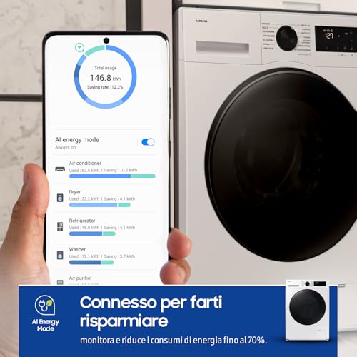 La connettività WiFi e l'integrazione con l'app SmartThings aprono un mondo di possibilità. È possibile controllare e programmare la lavasciuga da remoto tramite smartphone, ricevere notifiche sullo stato del ciclo e persino ottenere consigli sul programma più adatto in base al tipo di carico (Laundry Recipe). L'AI Energy Mode, gestibile tramite l'app, permette di monitorare i consumi e di ridurli ulteriormente, ottimizzando i cicli di lavaggio e asciugatura.