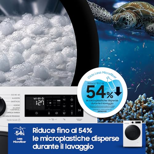 Nell'uso quotidiano, la Samsung WD90DG5B15BEET dimostra di essere un'alleata affidabile. I 17 programmi disponibili coprono ogni esigenza: dal classico Cotone ai Sintetici, passando per cicli specifici come Lana/Delicati, Rapido 15' e persino un programma dedicato a ridurre il rilascio di microfibre (Less Microfiber), sviluppato in collaborazione con Patagonia. La centrifuga a 1400 giri/min assicura che i capi escano ben strizzati, riducendo i tempi di asciugatura.