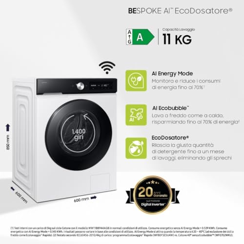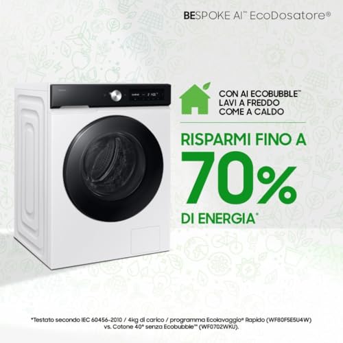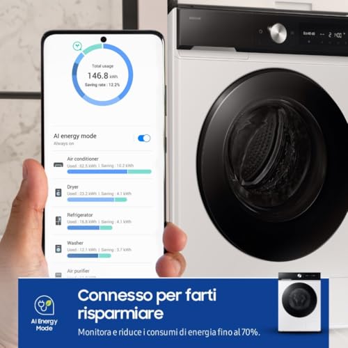L'intelligenza artificiale si estende anche al risparmio energetico. Con l'AI Energy Mode, gestibile tramite l'app SmartThings, è possibile monitorare i consumi e ridurli significativamente. Questa modalità, abbinata alla tecnologia AI Ecobubble™, permette di lavare efficacemente anche a basse temperature, trasformando il detersivo in bolle che penetrano più a fondo nei tessuti. Il risultato? Un risparmio energetico che può arrivare fino al 70% senza compromettere la qualità del pulito.