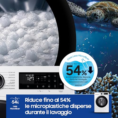 Samsung dimostra una crescente attenzione alla sostenibilità ambientale con l'introduzione del ciclo Less Microfiber. Sviluppato in collaborazione con Ocean Wise Plastics Lab e Patagonia, questo programma specifico è progettato per ridurre fino al 54% il rilascio di microplastiche dai tessuti sintetici durante il lavaggio, un piccolo ma importante passo per combattere l'inquinamento dei nostri mari.