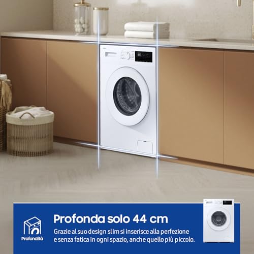 - Modello da 8 kg: Nonostante le dimensioni "slim" (circa 48 cm di profondità), offre una capacità generosa, adatta a famiglie di 3-4 persone.