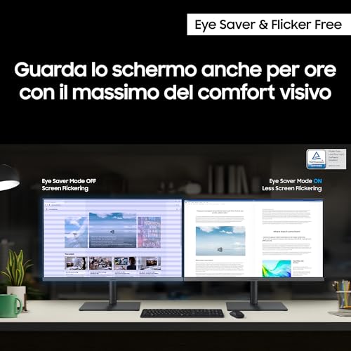 Samsung ha inoltre integrato alcune tecnologie per migliorare l'esperienza visiva e ridurre l'affaticamento degli occhi. La modalità Eye Saver, ad esempio, riduce le emissioni di luce blu, mentre la tecnologia Flicker-Free elimina lo sfarfallio dello schermo, permettendo sessioni di utilizzo più prolungate senza fastidi. Queste caratteristiche sono particolarmente apprezzate da chi passa molte ore davanti al computer per lavoro o studio.