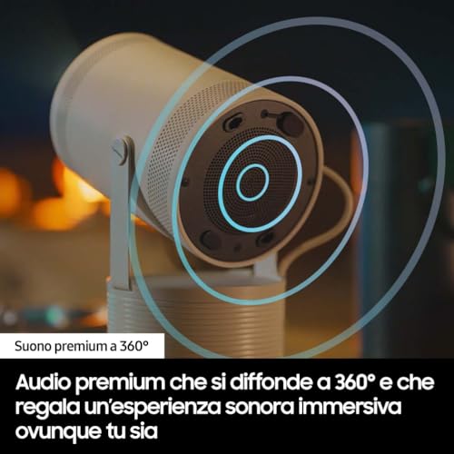 Il Samsung The Freestyle LSP3 non è semplicemente un proiettore portatile, ma un vero e proprio centro di intrattenimento compatto. Immagina di avere una Smart TV, un altoparlante intelligente e un proiettore di alta qualità, tutto in un unico dispositivo cilindrico che sta comodamente in una mano. L'idea di Samsung è quella di offrire la massima flessibilità: puoi proiettare i tuoi film preferiti sul soffitto della camera da letto, trasformare una parete del salotto in uno schermo gigante per una partita di calcio o goderti una serata cinema all'aperto.