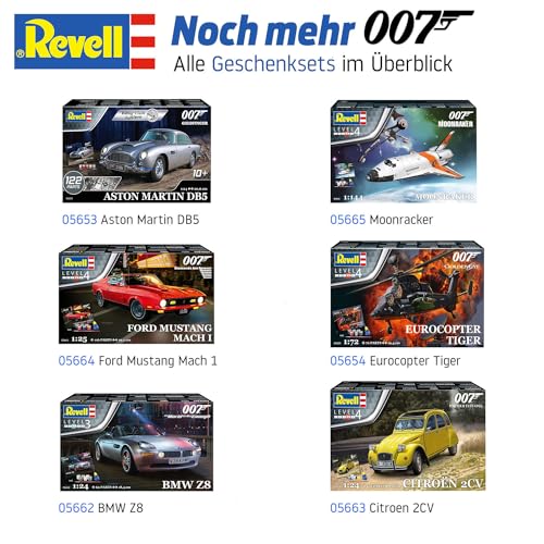 L'Aston Martin DB5 è forse l'auto di James Bond per eccellenza, un'icona di stile e tecnologia. Revell ce la propone in un kit "Easy-Click", pensato per un montaggio semplificato che, in teoria, non richiederebbe nemmeno l'uso della colla. In pratica, però, qualche goccia di adesivo è consigliata per assicurare una tenuta perfetta di alcuni componenti. Il kit è composto da 90 pezzi (secondo alcune fonti 122) e permette di ricreare la DB5 con tutti i suoi famosi gadget.