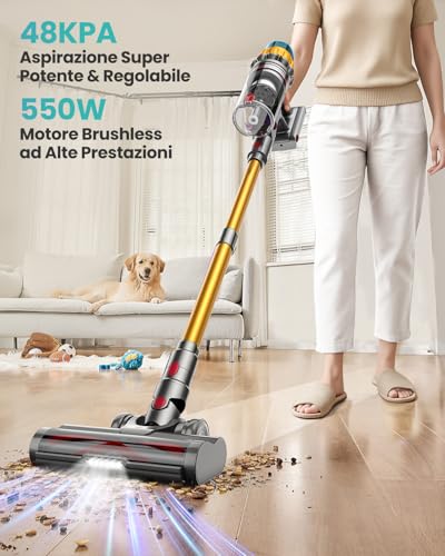 Il cuore pulsante di questo aspirapolvere è senza dubbio il suo motore brushless da 550W, capace di generare una potenza di aspirazione che arriva fino a 48 kPa (48000 Pa) in modalità Max. Questo dato tecnico si traduce in una capacità di pulizia notevole, in grado di affrontare non solo la polvere fine, ma anche detriti più grossolani, capelli e i temutissimi peli di animali domestici. Abbiamo testato l'aspirapolvere su diverse superfici, dai pavimenti duri in gres ai tappeti a pelo corto, e in ogni situazione ha dimostrato un'efficacia sorprendente, rimuovendo lo sporco con una sola passata.