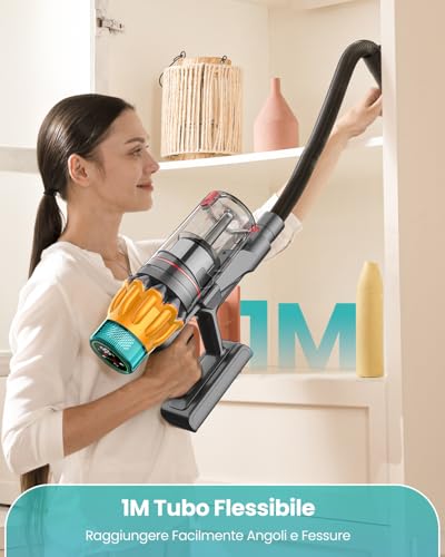 La maneggevolezza è garantita dalla spazzola principale a forma di V, progettata specificamente per ridurre l'aggrovigliamento di peli e capelli. La sua testa snodabile con una rotazione di 270° consente di raggiungere con facilità gli angoli più difficili e di pulire agilmente sotto i mobili. Inoltre, le 6 luci LED frontali integrate nella spazzola sono una vera manna dal cielo per illuminare le zone d'ombra, come sotto il letto o il divano, assicurando che nessuna particella di polvere possa sfuggire.